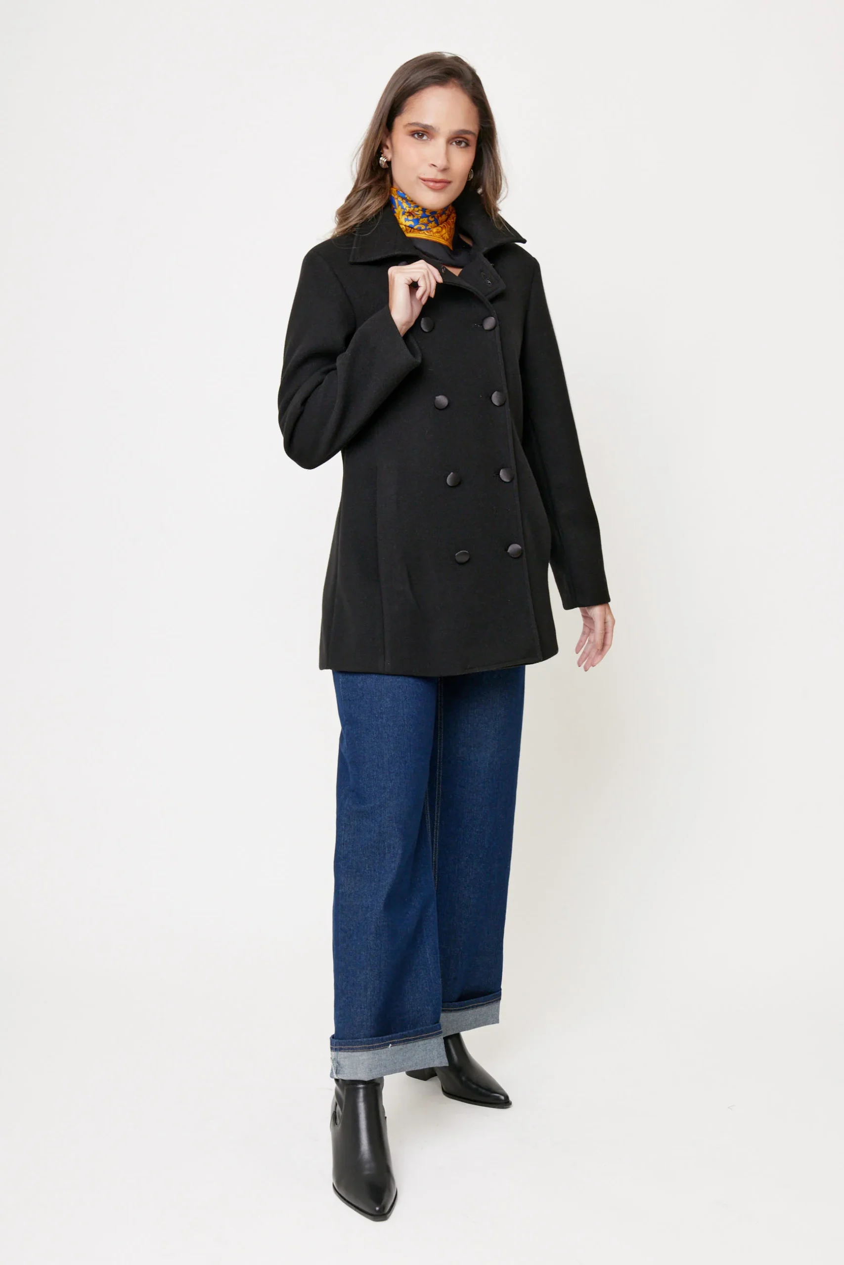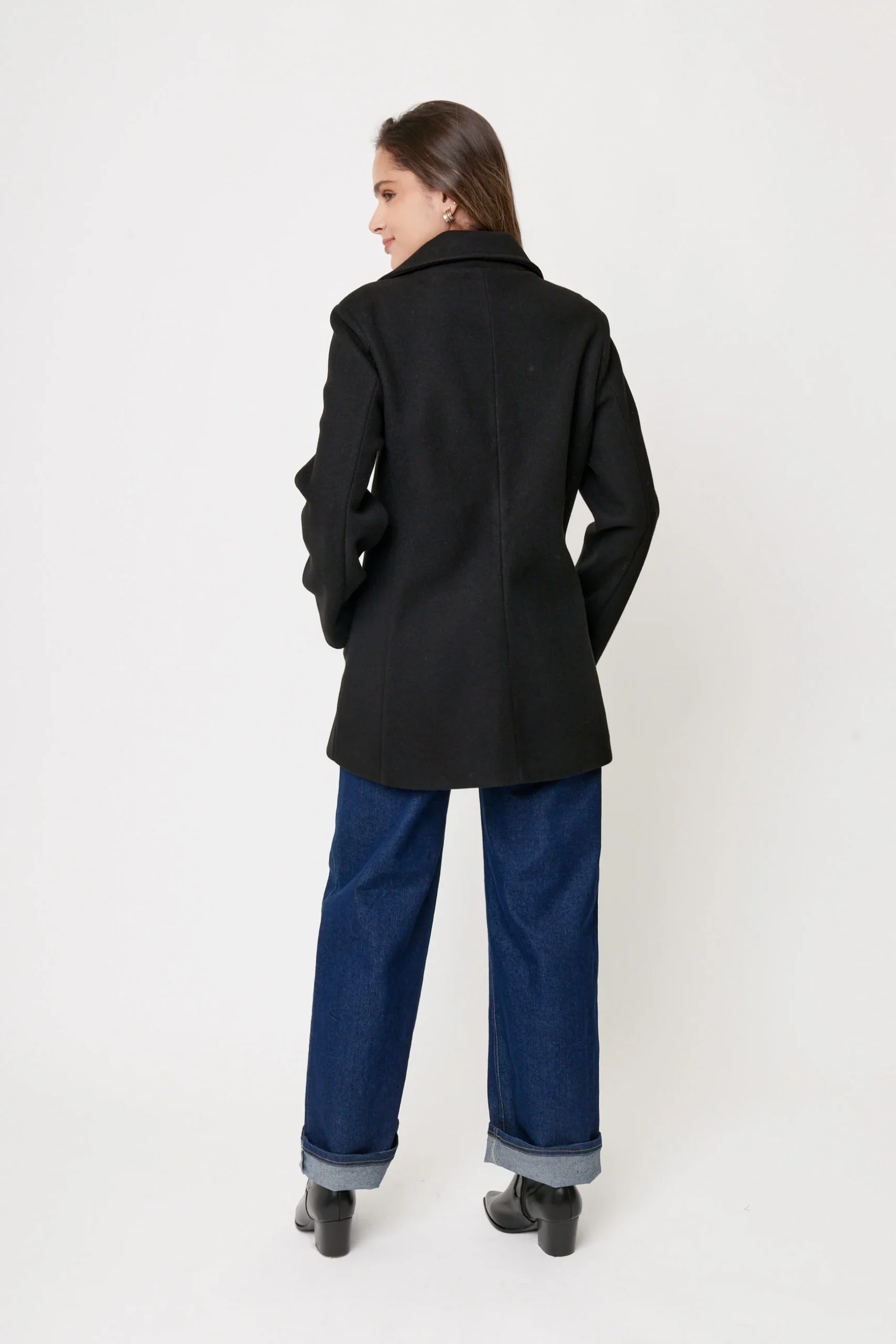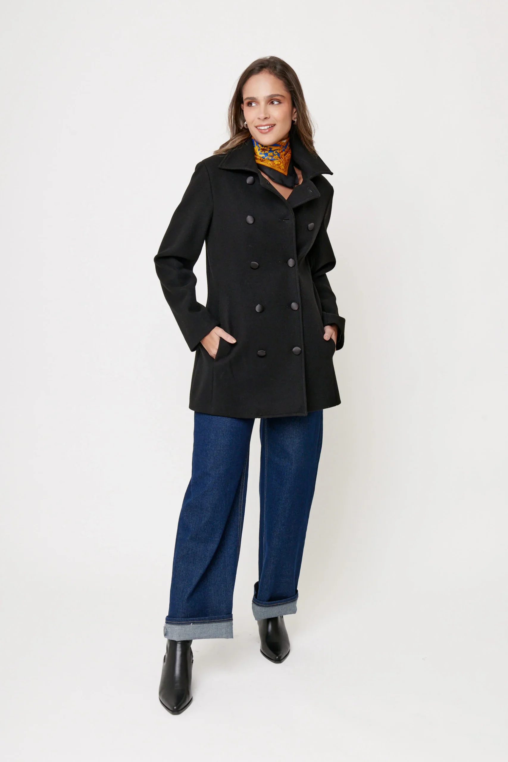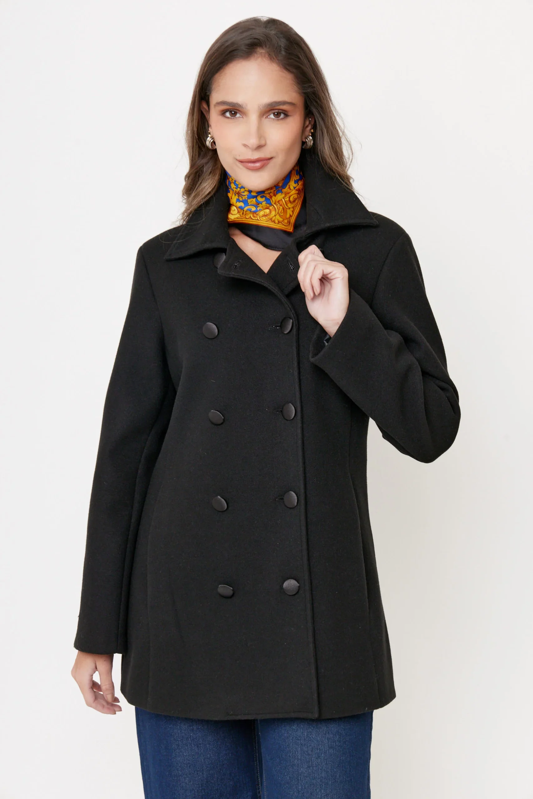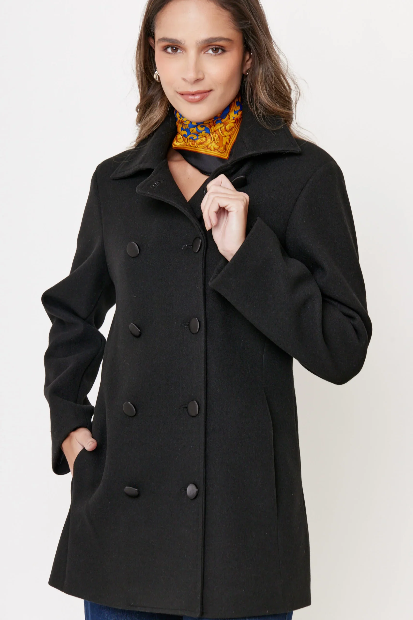 Abrigo negro de lana para mujer confeccionado en paño inglés 100% lana. Corte recto con ajuste sutil en cintura, cruzado con doble hilera de botones negros forrados en tela satinada, con cuello y solapa, bolsillos sobre costuras frontales. Largo regular.
