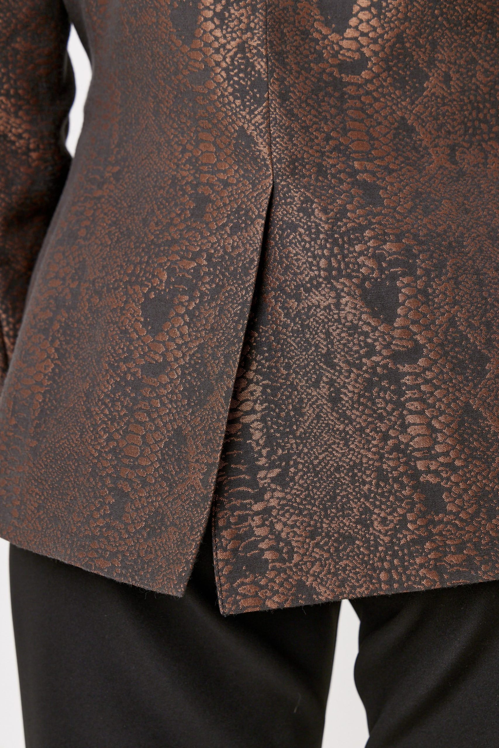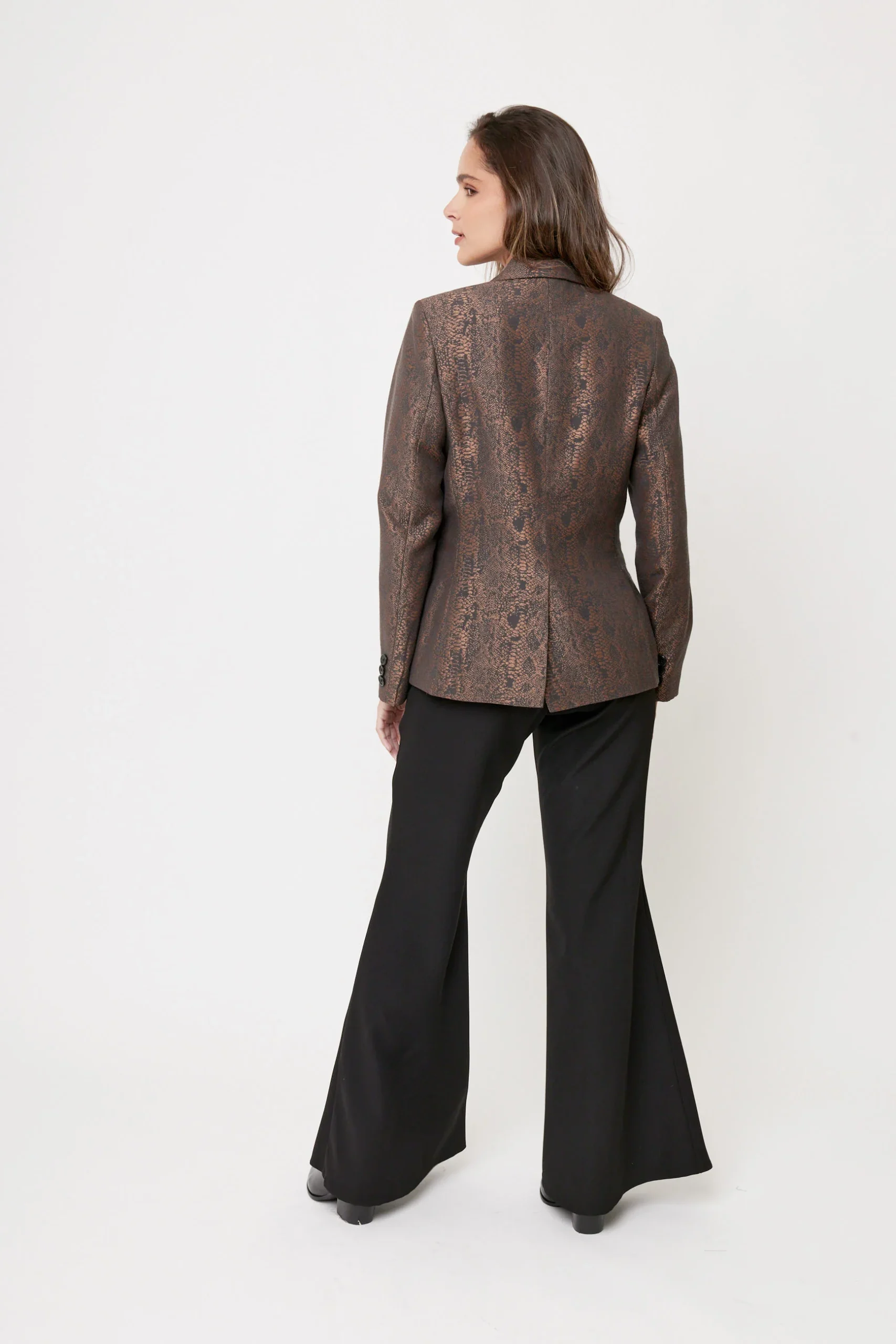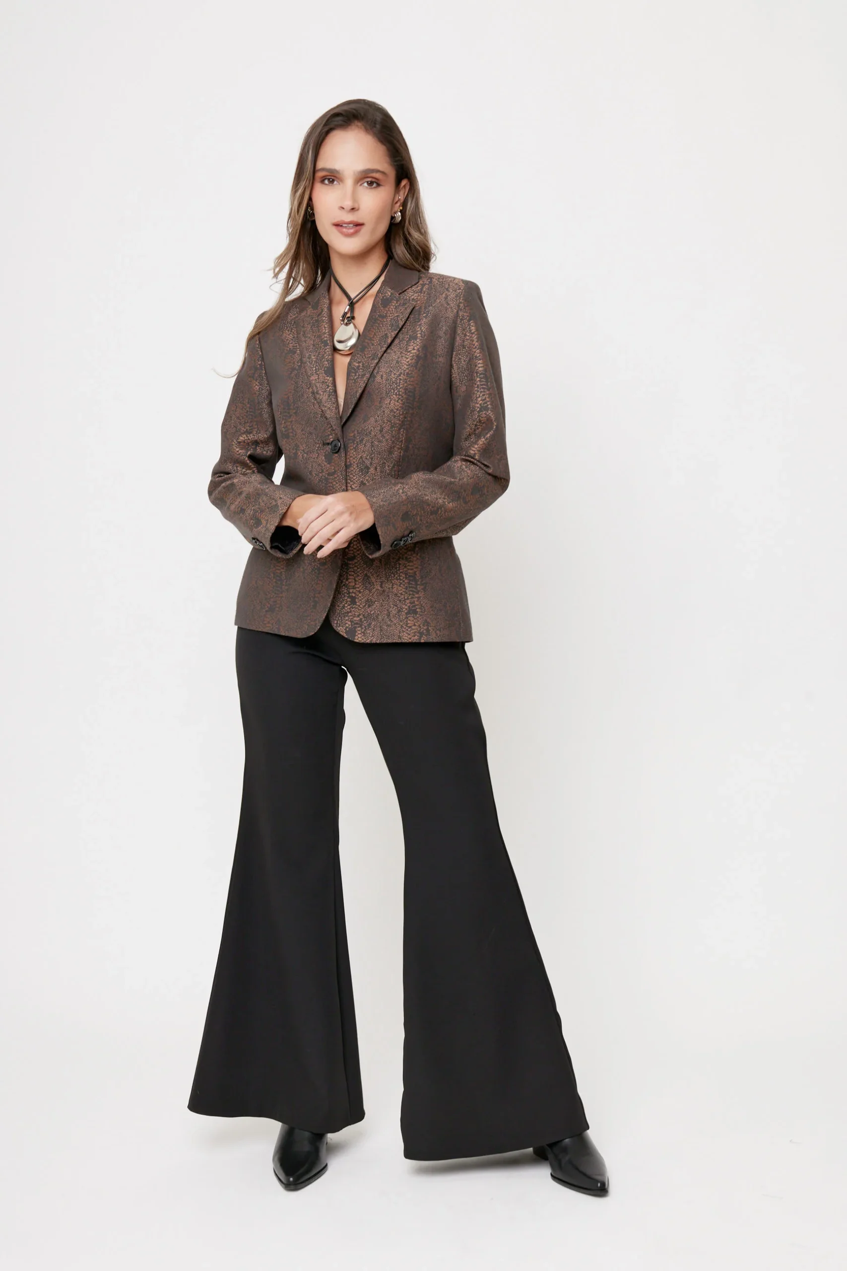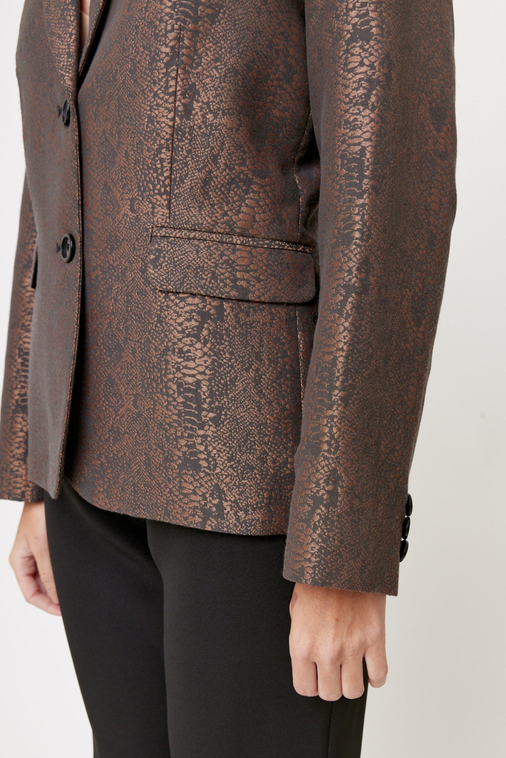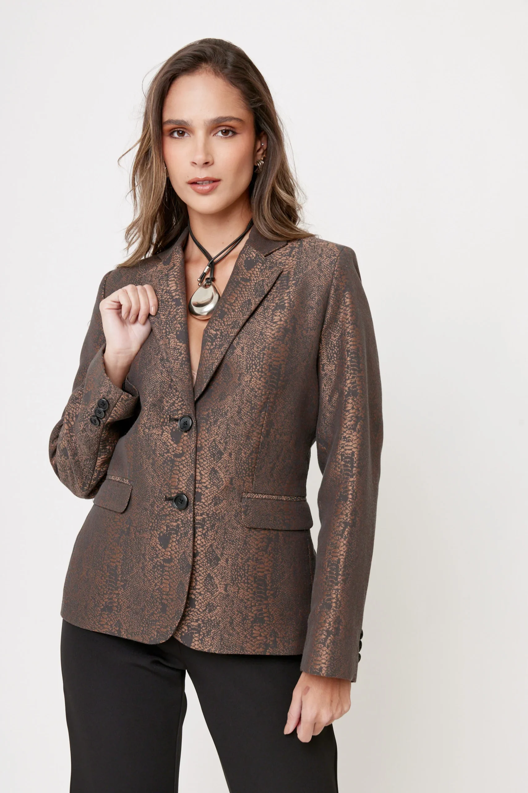 Blazer formal para mujer realizado en tafeta satinada animal print importada de España. Corte inglés ajustado en cintura y cadera, con solapa y dos botones frontales, manga larga con detalle de botones en puño. Largo regular.