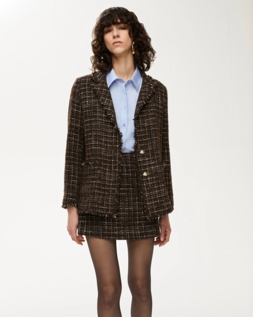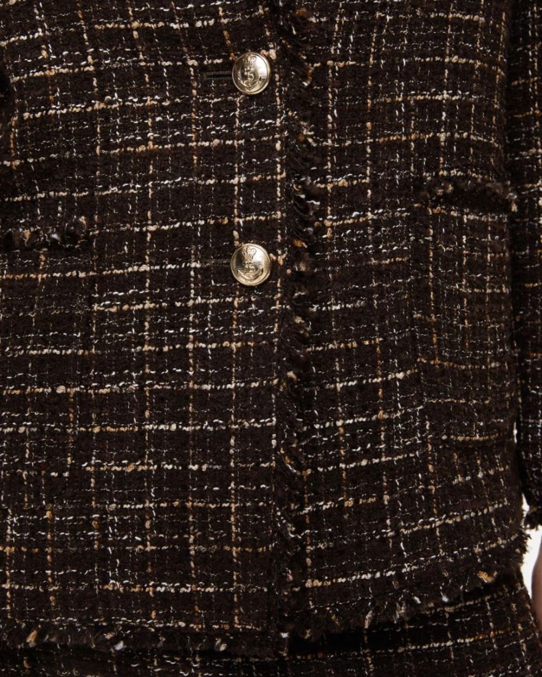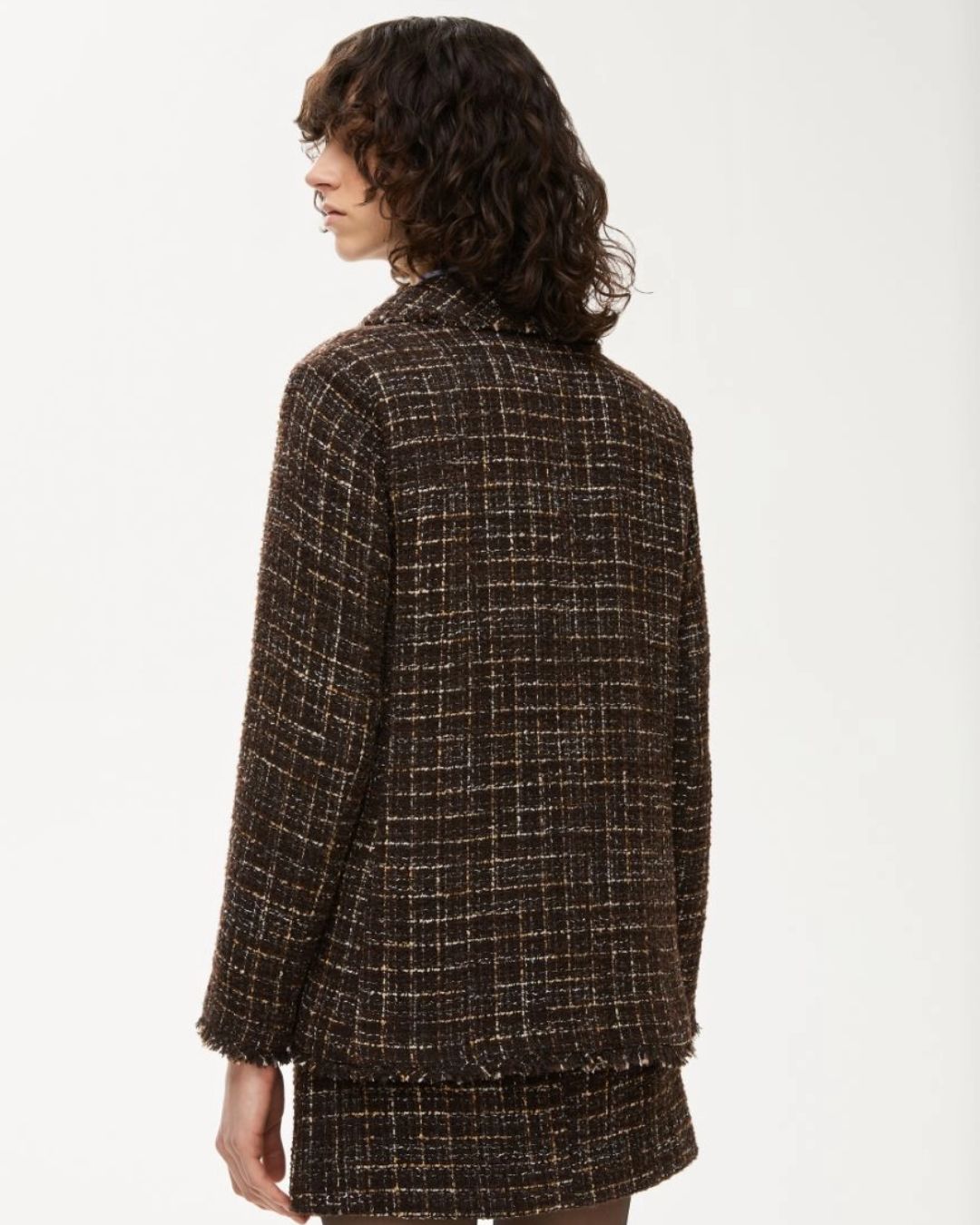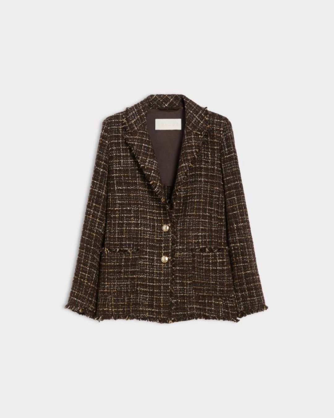 Blazer marrón iBlues de mujer en tejido basketweave con brillo lamé. Corte recto, detalles desflecados y estilo parisino. Disponible en Llenas 1953 Barcelona.