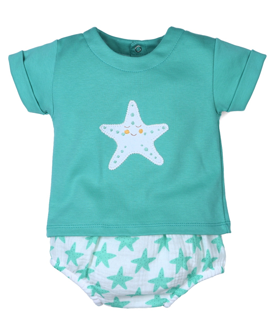 Conjunto para niño cien por cien algodón compuesto por camiseta color verde agua con bordado de estrella y ranita con estampado a juego.