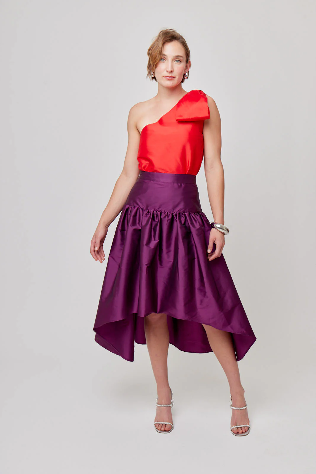 Falda asimétrica formal para mujer confeccionada en tafeta seda importada. Corte ajustado en cintura y cadera, con pretina ancha y cierre trasero, falda fruncida a nivel de cadera con largo irregular.